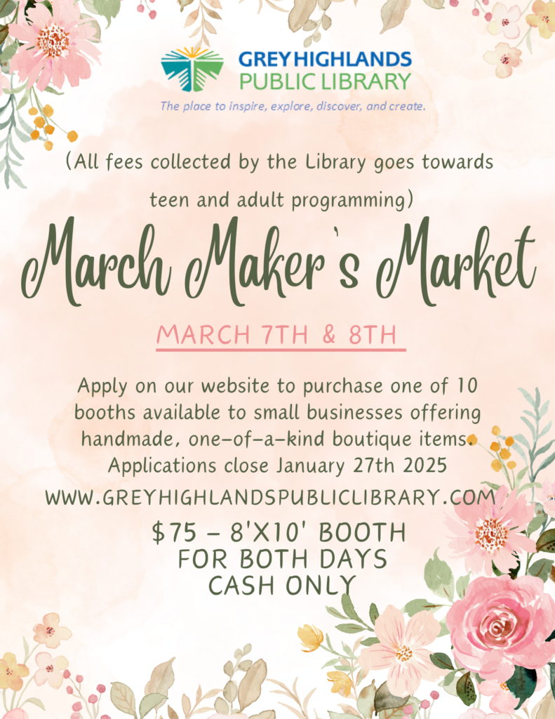 Don’t miss out on the Grey Highlands Public Library’s very first March Maker’s Market! This unique, two-day event is set to be an unforgettable experience, featuring 10 hand-selected vendors showcasing their finest handmade items. Expect to discover a variety of unique treasures, from stunning jewelry and elegant home decor to fashionable bespoke clothing and delectable gourmet treats. Plus, the library will host a series of engaging workshops, offering hands-on activities and live demonstrations that highlight the creativity and craftsmanship of our community.